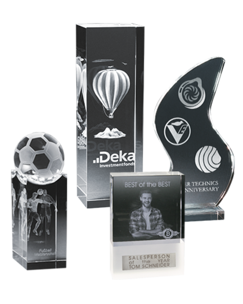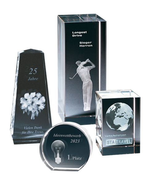 Auch im Bereich Werbemittel & Promotion werden die Contento 2D & 3D Laserinnengravuren sowie die Oberflächengravur-Techniken eingesetzt: für die Veredelung exklusiver Pokale, Trophies & Awards aus Glas für Prämierungen oder als Auszeichnungen, für die Individualisierung von Werbegeschenken aus Glas, Holz, Metall etc. für Promotionveranstaltungen und vieles mehr.